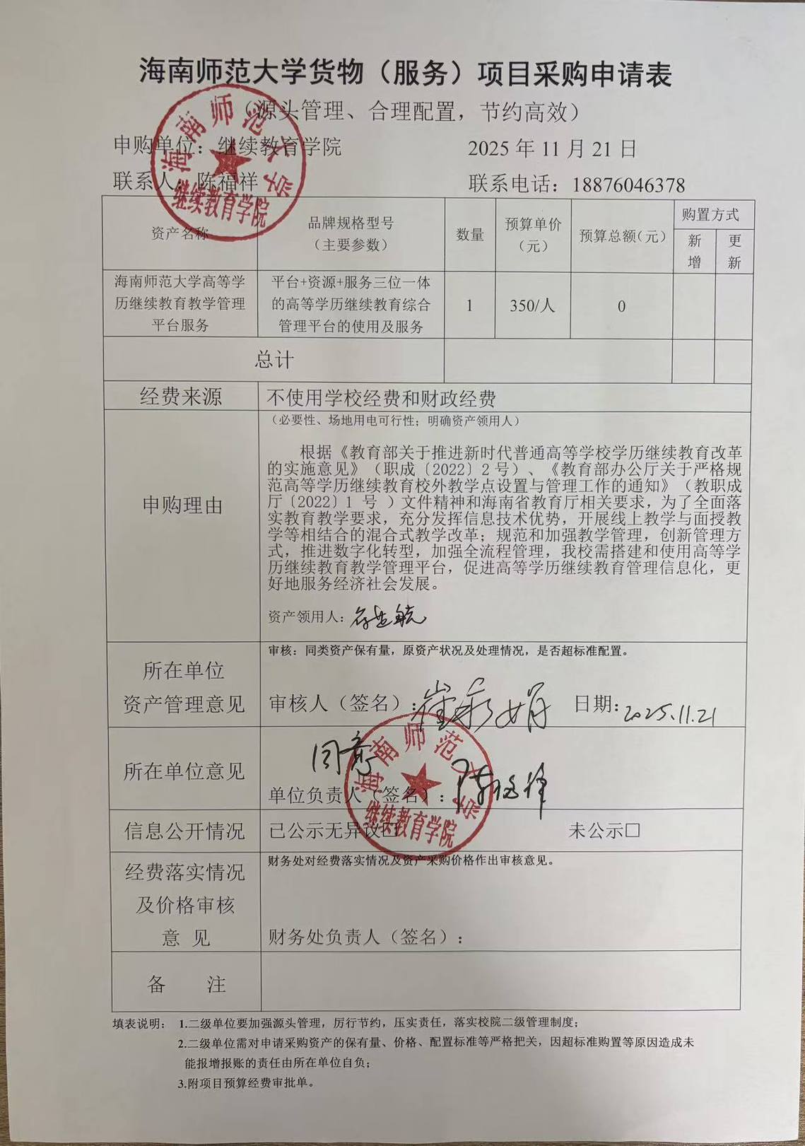 根据有关要求,为促进高等学历继续教育教学管理信息化,海南师范大学继续教育学院需招标购买高等学历继续教育教学管理平台服务。按照相关规定,现对采购相关材料公示如下,如有疑义,请致电65815991。